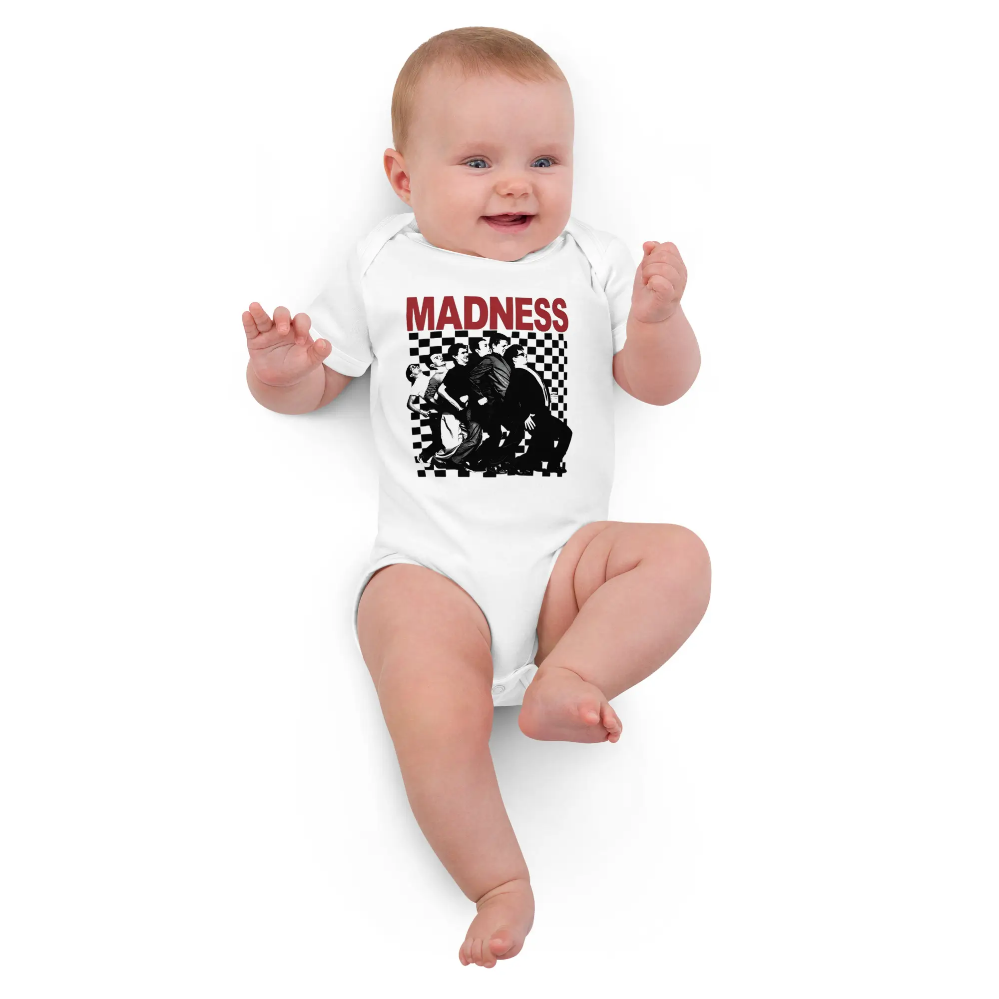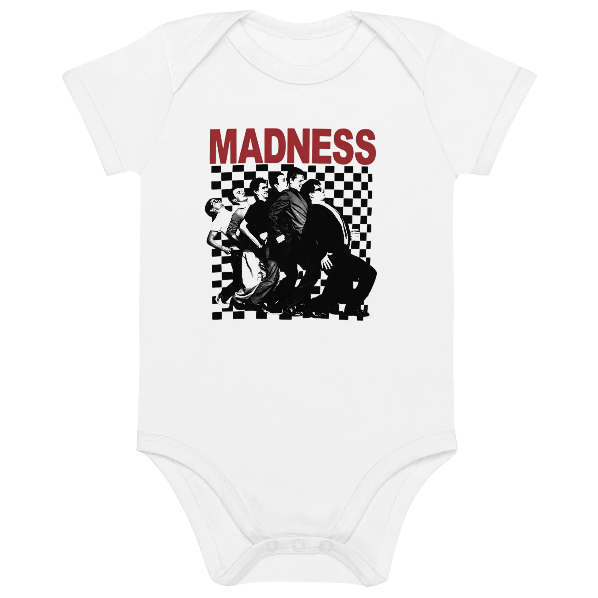 Body de Bebé Madness, este body celebra a lendária banda britânica Madness. A estampa exibe a icónica pose “Nutty Train” sobre o clássico padrão axadrezado. É a escolha ideal para pais que amam música e estilo desde o primeiro dia.