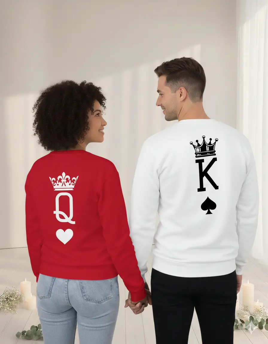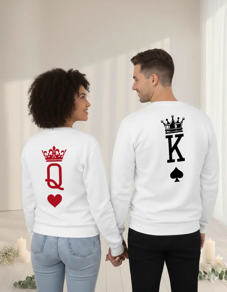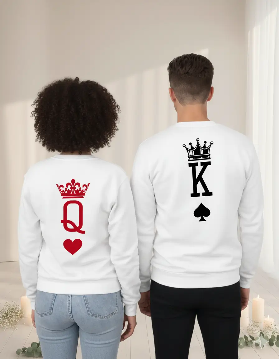 Sweats Personalizadas Dia dos Namorados, King & Queen. Celebre a vossa ligação com estilo e conforto superior. Nesse sentido, esta sweatshirt unissexo combina, não só um design minimalista, mas também a simbologia clássica do baralho de cartas. Consequentemente, torna-se a escolha ideal para casais que procuram um visual coordenado com um toque de sofisticação.