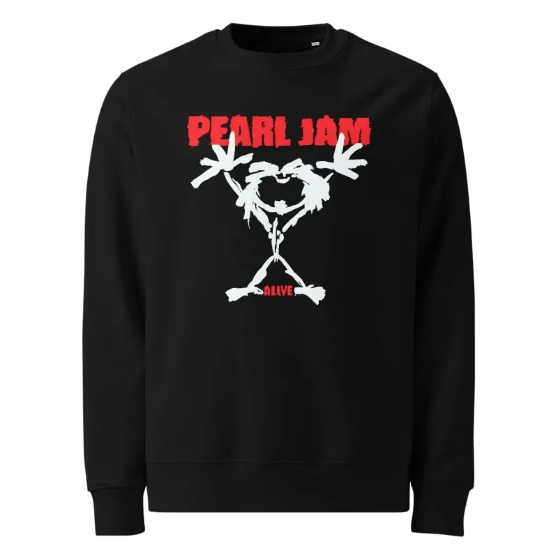 Esta sweatshirt preta é uma peça obrigatória para qualquer fã da icónica banda de grunge, Pearl Jam. No centro, o design em branco e vermelho evoca a energia crua e a arte visual característica do grupo. A estampa destaca-se com uma figura esguia e frenética, de braços levantados e boca aberta num grito, representando a emoção e a intensidade das performances da banda. Acima, o nome PEARL JAM é exibido em letras vermelhas com um aspeto de pincelada, enquanto a palavra ALIVE aparece discretamente na parte inferior.