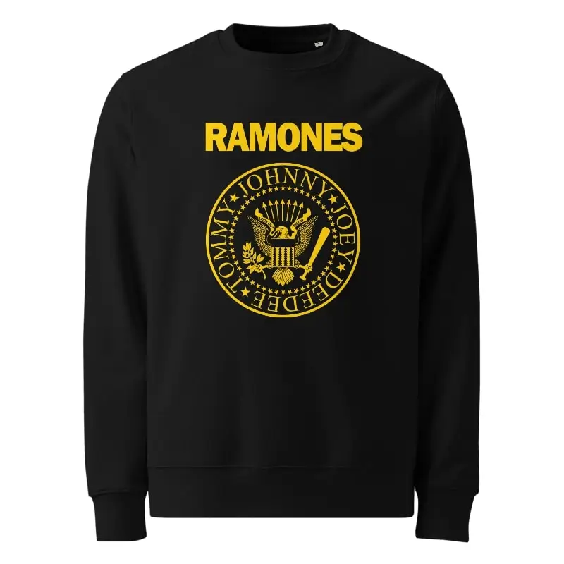 Esta sweatshirt preta é uma ode ao punk rock com o logo lendário dos Ramones. A estampa, em amarelo vibrante, apresenta o icónico selo circular da banda, inspirado no emblema presidencial dos EUA. No centro, uma águia americana segura um ramo de oliveira e um taco de basebol, simbolizando uma fusão de paz e rebeldia. Ao redor, estão os nomes dos quatro membros originais — JOHNNY, JOEY, DEEDEE e TOMMY —, emoldurados por estrelas. Acima do logo, o nome da banda, RAMONES, é exibido em letras maiúsculas.