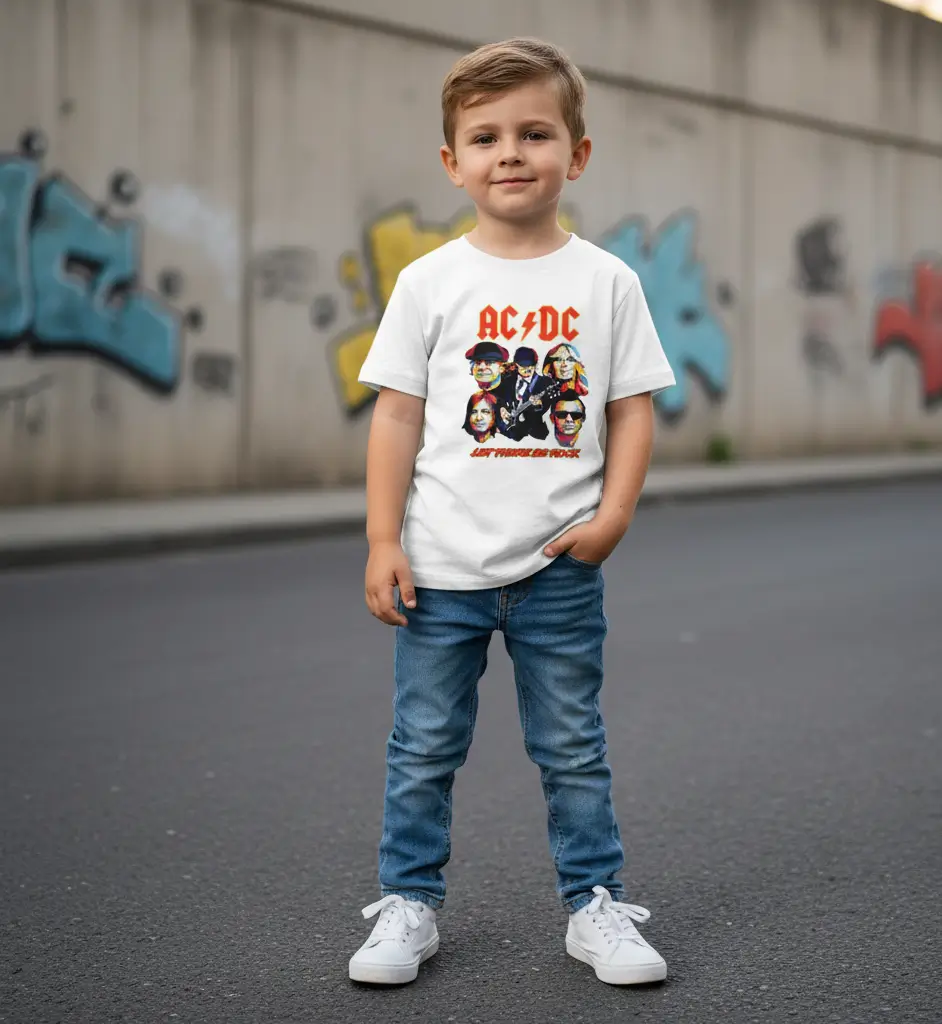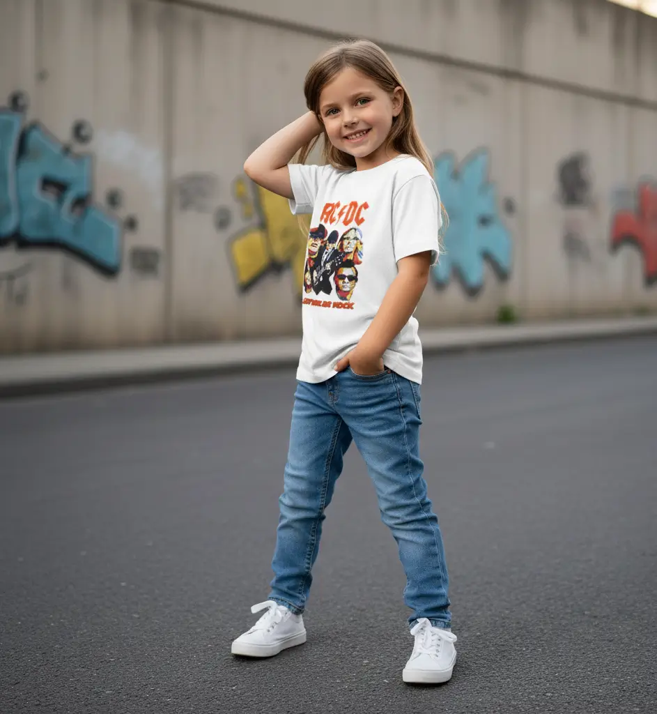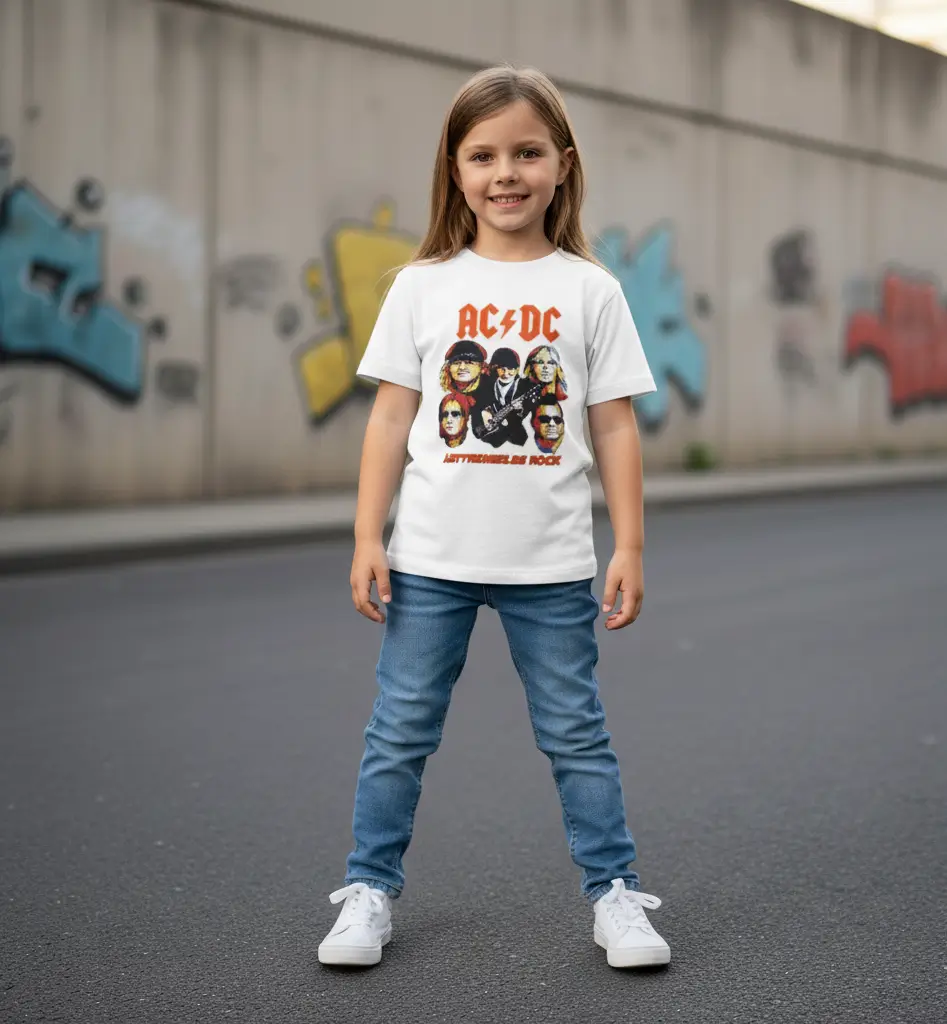 Esta t-shirt branca de corte clássico é a peça ideal para os pequenos fãs (e futuros guitarristas) que já sabem que o rock não tem idade. Com um design vibrante em estilo Pop Art, esta t-shirt celebra a lendária banda AC/DC e o seu icónico álbum “Let There Be Rock”.