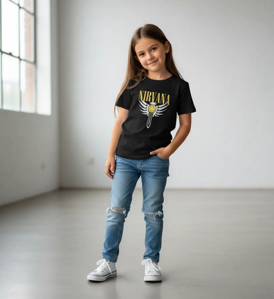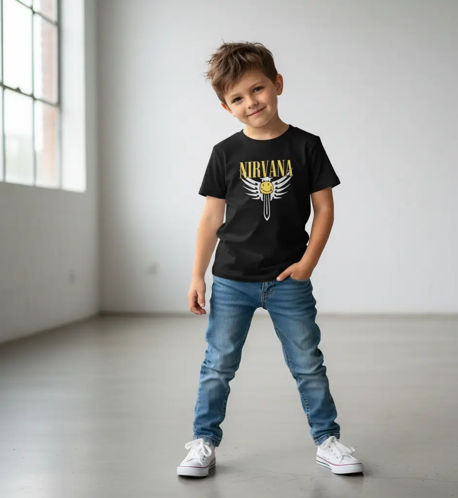 T-Shirt criança Nirvana Smile Wings. Para pequenos com atitude e personalidade, esta t-shirt de criança traz uma estética marcante inspirada no universo do rock. A estampa central em destaque combina o lettering “NIRVANA” com um smile estilizado com asas, criando um visual moderno, ousado e cheio de identidade.