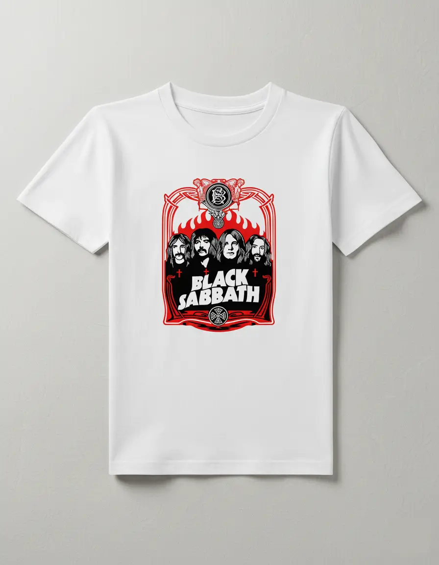 Design Icónico: Estampa detalhada com os rostos dos membros da banda, moldura estilizada e o logótipo clássico que marcou gerações.